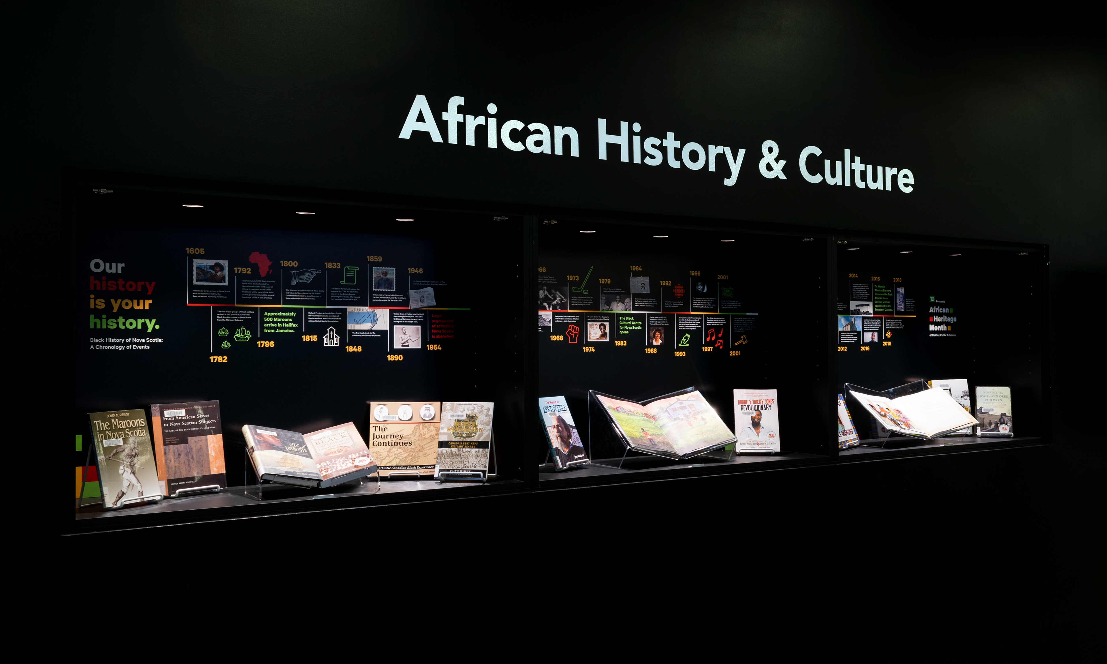 As part of African Heritage Month at Halifax Public Libraries, we were tasked with updating the African History & Culture display at the central branch. To highlight and educate the public on the achievements and contributions of African Nova Scotians, a timeline was created to reflect significant events starting at the year 1605 and continuing to the present day. In addition, key pieces of the Library’s African history collection were displayed as part of African Heritage Month and refreshed as needed. The timeless nature of the design will allow it to remain up throughout the year with items from the collection being changed periodically.